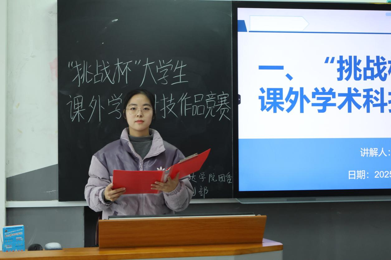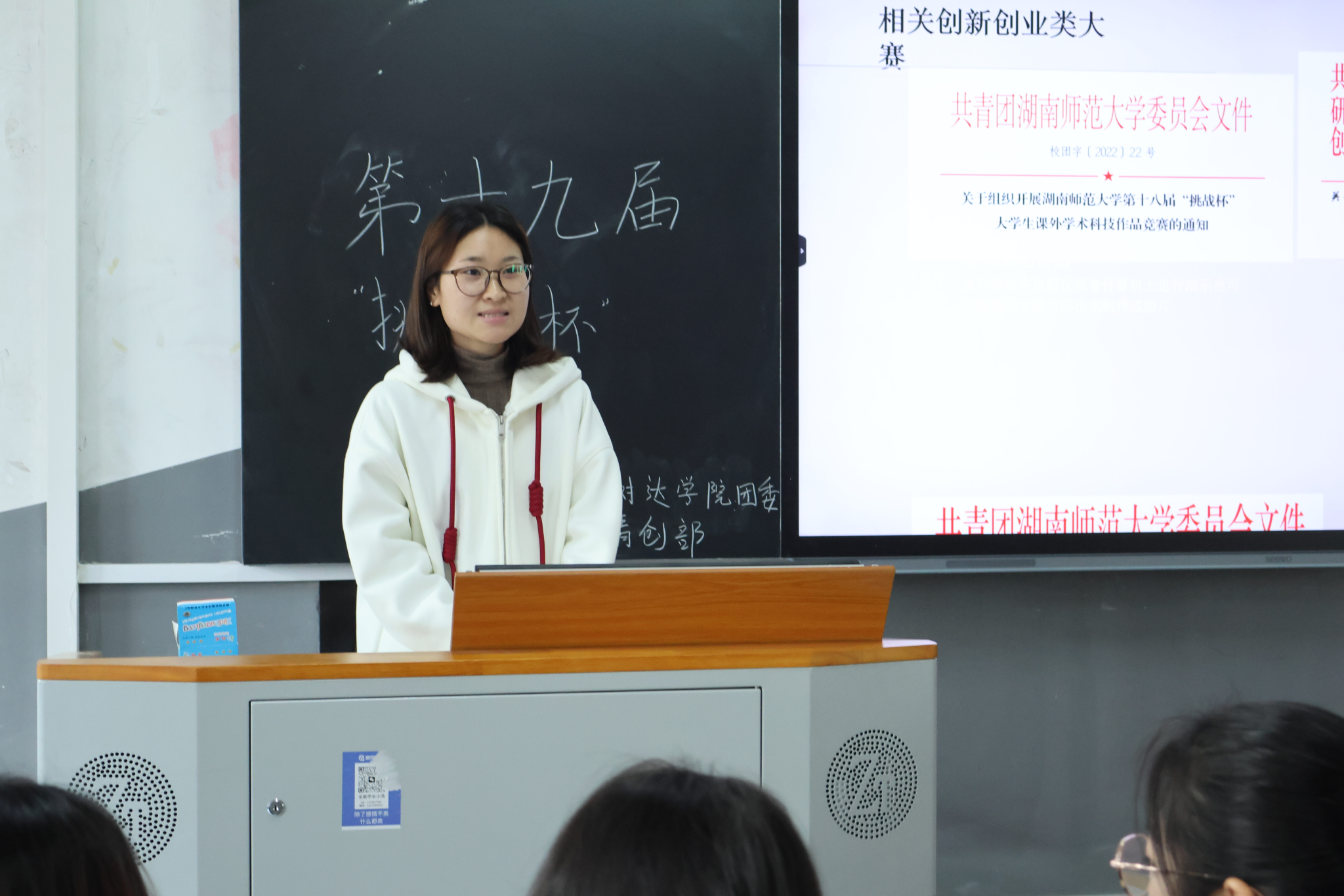 (通讯员 刘紫琼 向媛钰 周劲翔)2月28日中午,团委青年创新创业指导部在树达楼115教室开展公司第十九届“挑战杯”老员工课外学术科技作品竞赛宣讲会。2021级电子信息科学与技术专业易雨担任主讲人。