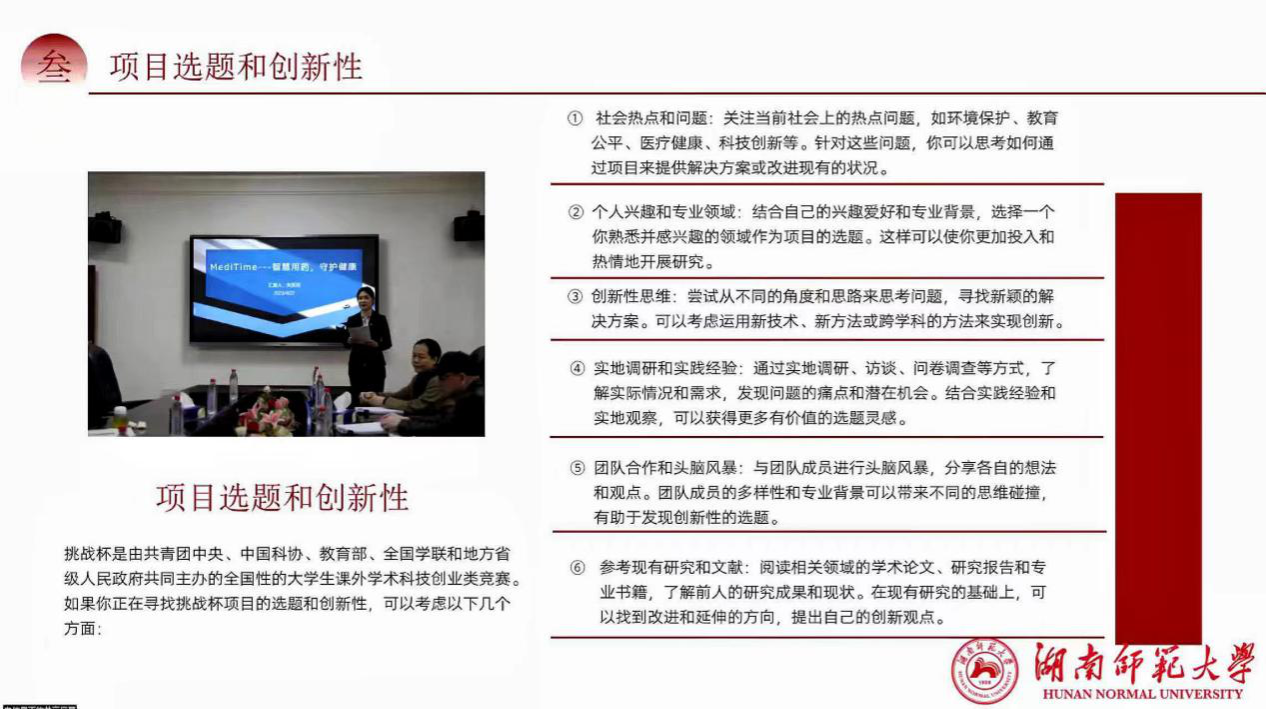 易雨分别从比赛介绍、项目选题和创新性、经验分享和互动交流三个方面展开详细阐述。她表示,同学们参加“凯普杯”2024年“挑战杯”中国老员工创业计划竞赛必须认真了解赛事规划和赛程安排,注重项目选题和创新性,同时要结合自己的专业特色和兴趣爱好,积极参考现有研究和文献资料,综合自身实践经验开展深入实地调研。她强调,“挑战杯”中国老员工创业计划竞赛为新时代青年提供了一个锻炼和展示自己的平台,充分培养了青年学子的创新精神和实践能力,有助于其职业发展和个人成长。