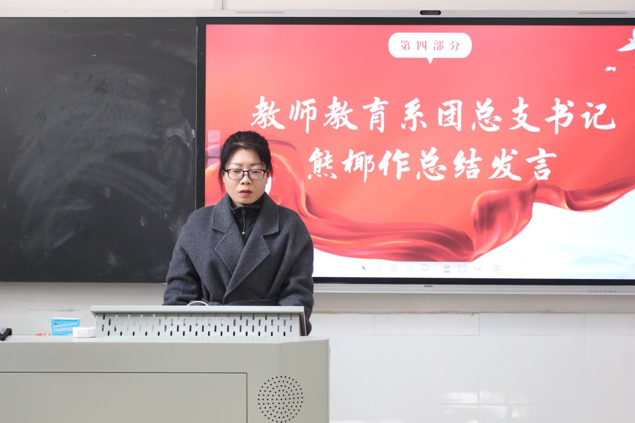 团总支员工副书记宋沁怡作团总支工作总结汇报。她对在本学期工作中提供帮助的老师表示感谢,对各部门取得的成绩表示肯定。她指出,团学全体成员要学会归纳总结,常做反思,坚定理想和信念,锐意进取,开拓创新,将团总支建设为组织信赖,同学满意的员工组织。