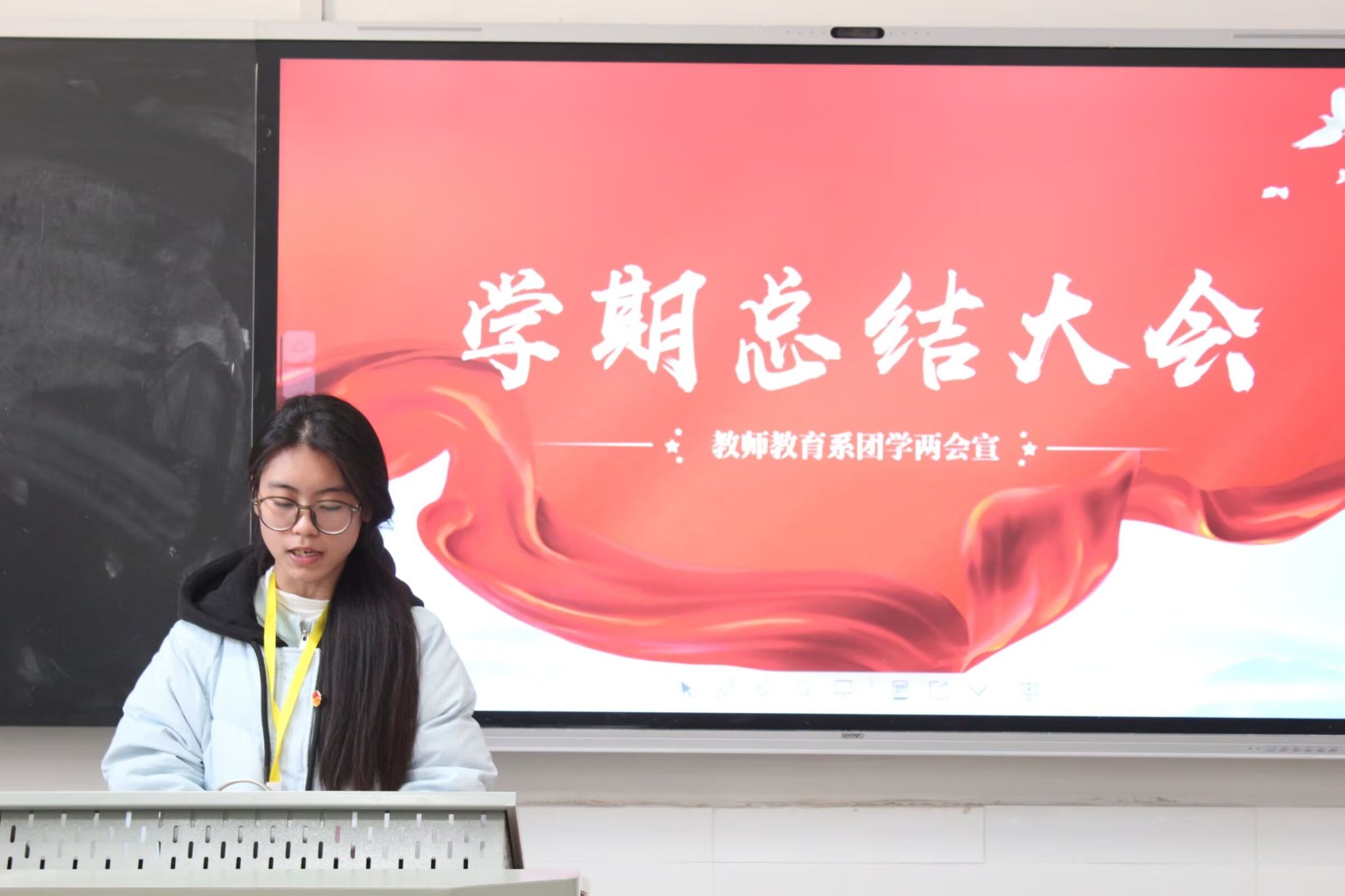 员工会主席团成员贺思宇就员工会本学期工作进行总结,并分享工作感悟。她强调,下一学期的工作需要更加注重活动质量,强化内部的团结协作。她希望,团学成员能够进一步提高工作积极性和主动性,发扬优点,改进不足,努力为同学们提供更好的服务,共同为校园文化建设努力。