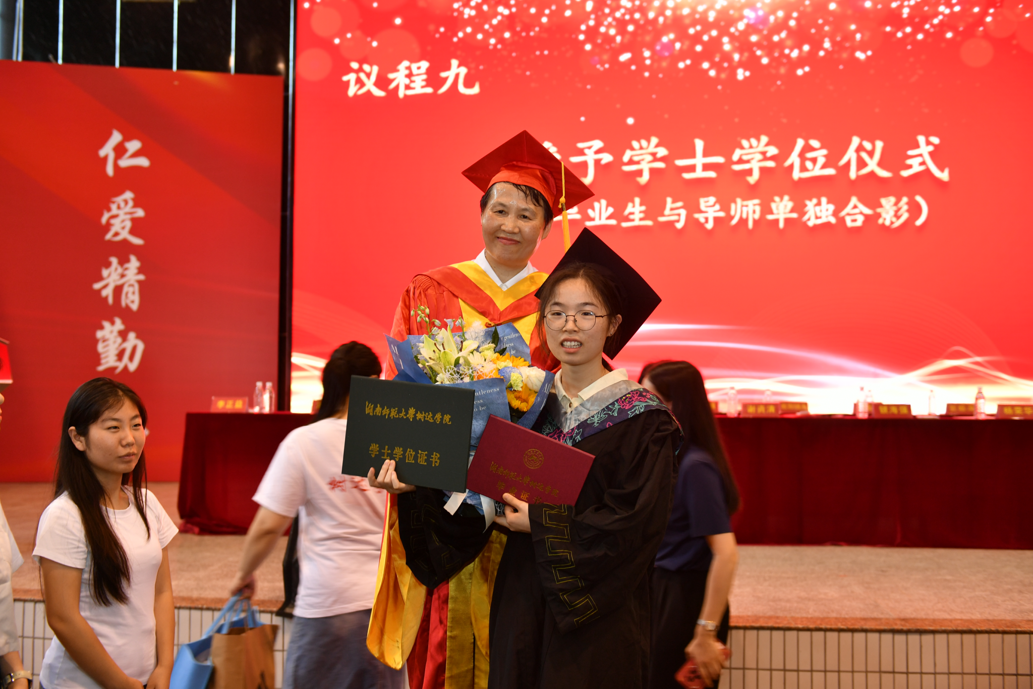 各位导师为毕业生正冠拨穗,并颁发毕业证书、学位证书。