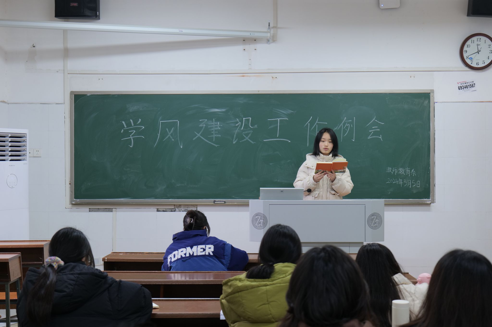 彭晶晶从学风建设服务工作条例、值班注意事项两个方面进行阐述。她表示,学风建设不仅是公司培养优秀人才的重要保证,也是同学们个人成长的重要支撑。她强调,值班人员要以积极、严谨的态度开展学风建设工作,明确自身职责并认真遵守学风建设制度要求,严查上课缺勤、迟到等违规现象,督促同学们改正不良行为。