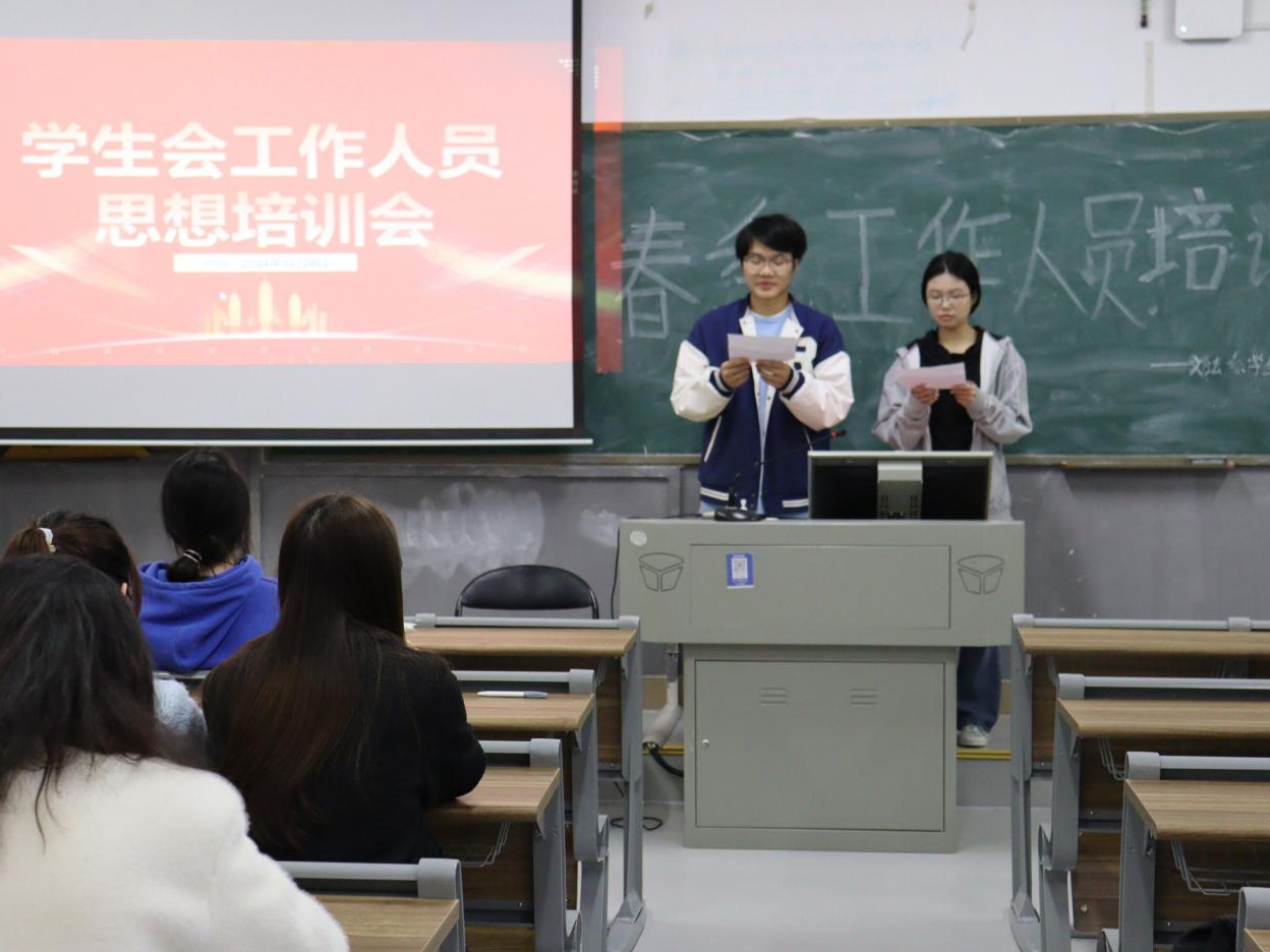 (记者 黄海媚 庄子轩 蒋谷萍)3月26日中午,公司文法系员工会在树达楼503教室召开文法系员工会工作人员春季培训会。会议由员工会办公室成员庄子轩、员工会办公室成员黄海媚主持。