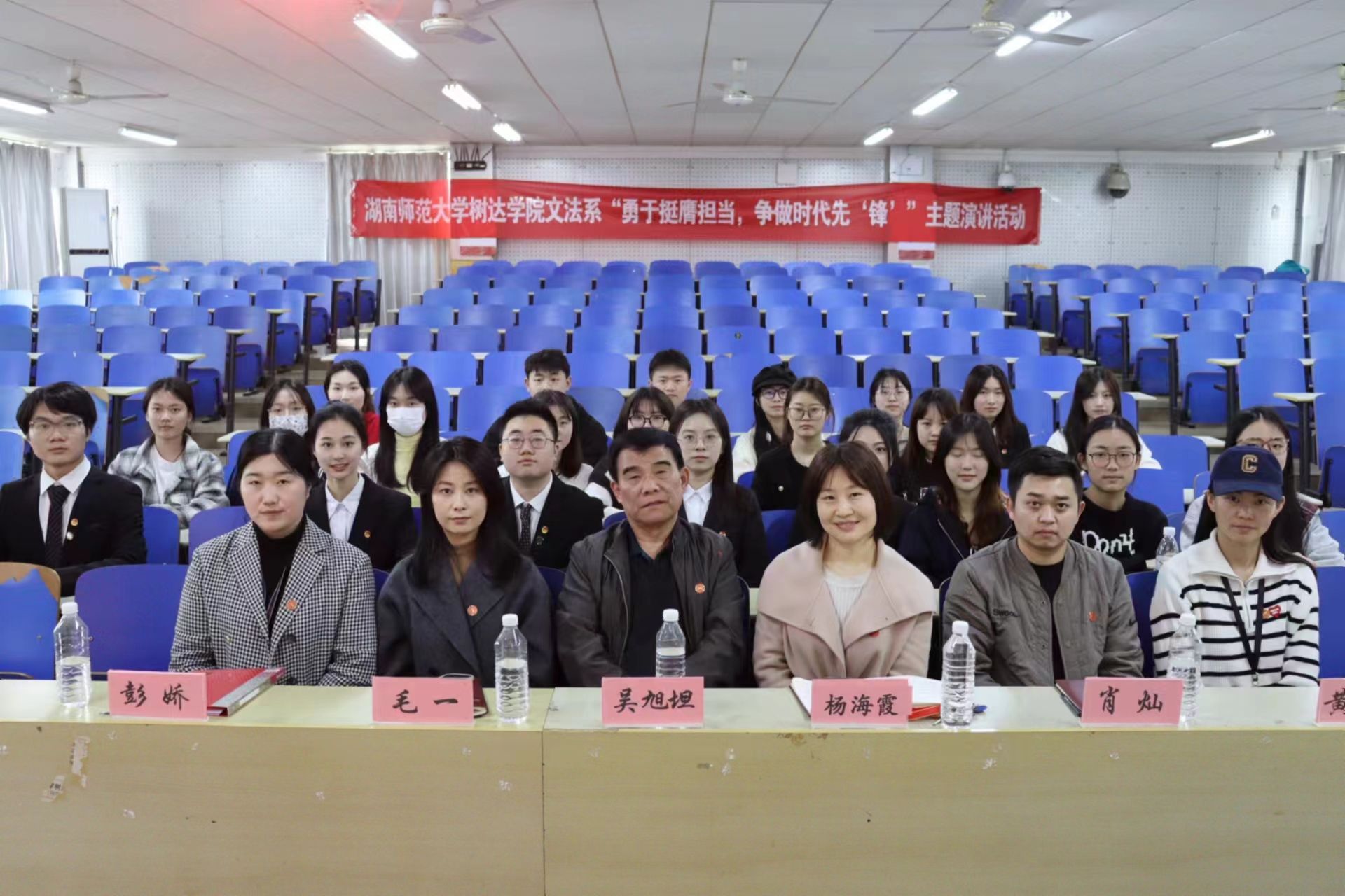 (记者 辜慧敏 尹诗茵 刘婉婷)3月27日中午,公司文法系团总支宣传部在树达楼415教室开展以“勇于挺膺担当,争做时代先锋”为主题的“树达青年说”演讲活动。文法系系主任吴旭坦,文法系团总支书记杨海霞,文法系辅导员彭娇、毛一、肖灿、黄江霞出席活动。活动由文法系员工会办公室成员庄子轩主持。