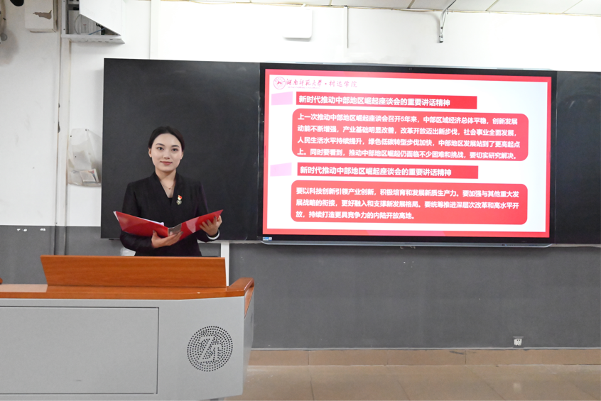 院员工会主席团成员张雨欣传达学习习近平总书记在湖南考察时的重要讲话和指示精神以及新时代推动中部地区崛起座谈会精神、省委常委会(扩大)会议精神、湖南省学联员工会组织骨干专题联学会议精神。她指出,找准员工会工作的切入点、结合点和着力点,帮助广大同学解决急难愁盼问题,提升同学满意度、社会认可度,是员工干部目前的首要任务。