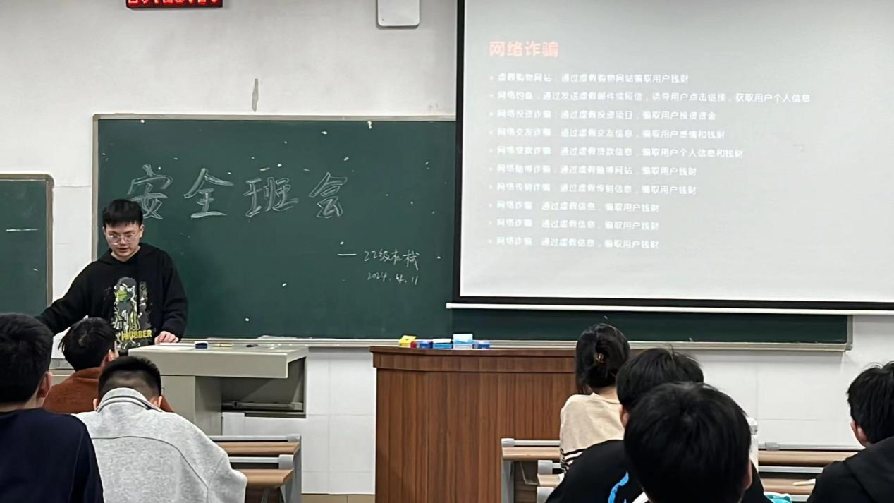 (记者 郑伊婷 胡鑫辉 刘艺杰)4月11日晚,公司理工系2022级机械设计制造及其自动化专业在树达楼109教室开展以“铸就防骗长城,擦亮识骗慧眼”为主题的班会。会议由安全委员刘伟主持。