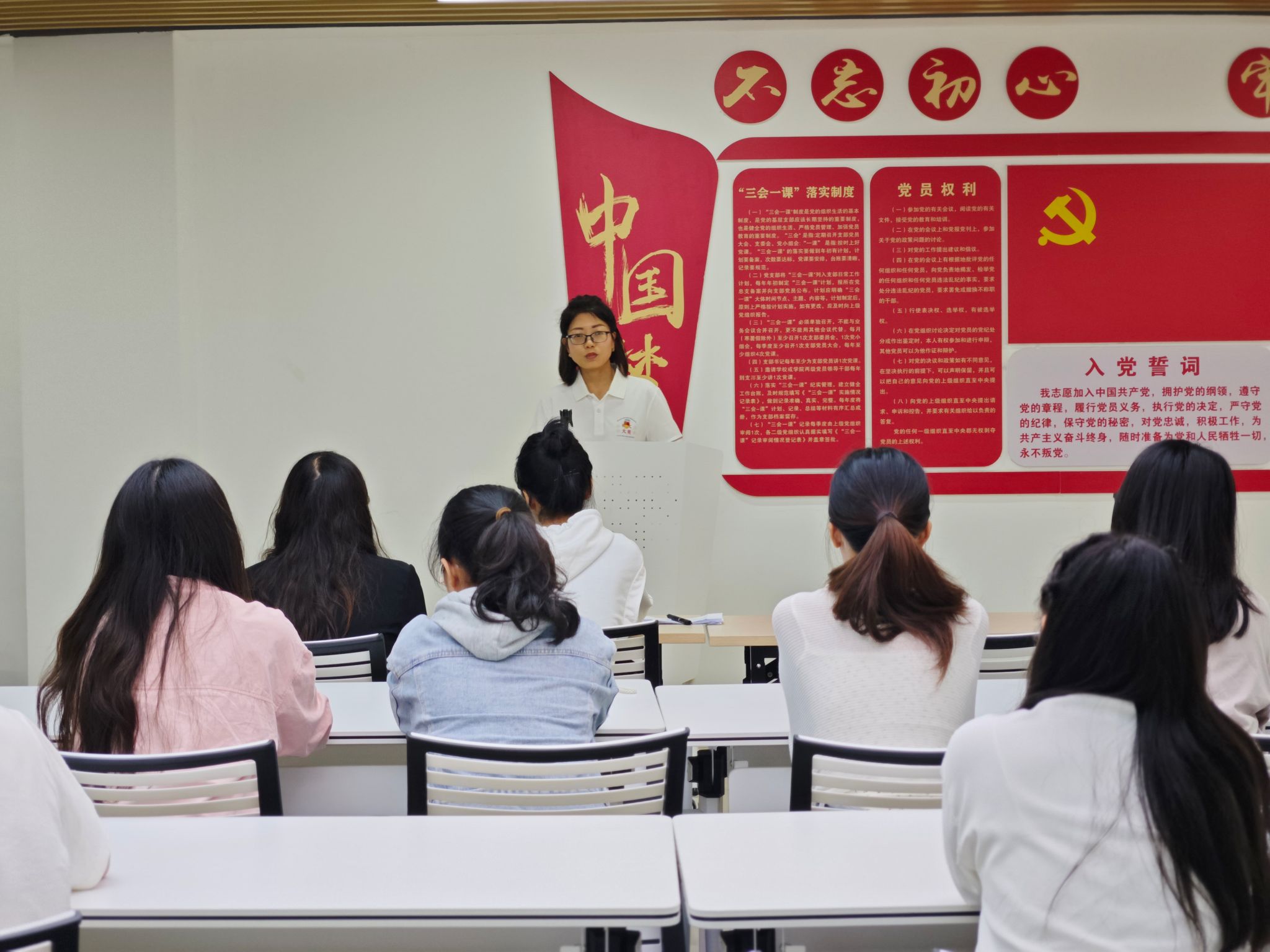预备党员张楚蓉等7名同志依次汇报在预备期间的表现情况,向党组织表明转正的态度和决心。