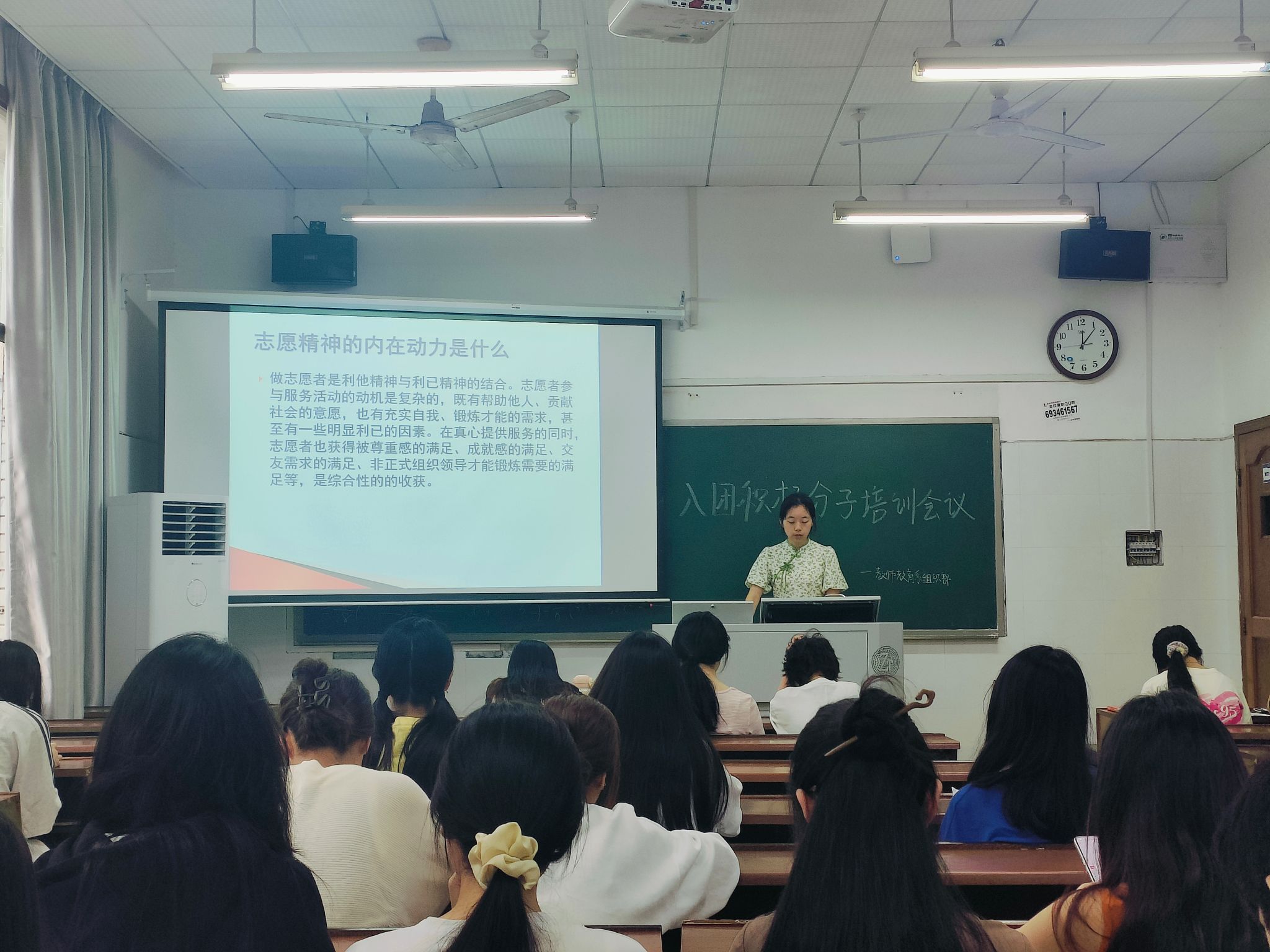 宋沁怡分别从老员工社会实践活动的形式、志愿者精神的内在动力、志愿精神的时代意义三个方面展开阐述。她表示,志愿精神不仅传承了中华民族助人为乐的传统美德,还体现了社会主义的基本要求。她希望,入团积极分子们有帮助他人、贡献社会的意愿,也有充实自我和锻炼才能的需求,在奉献中实现自己的价值。