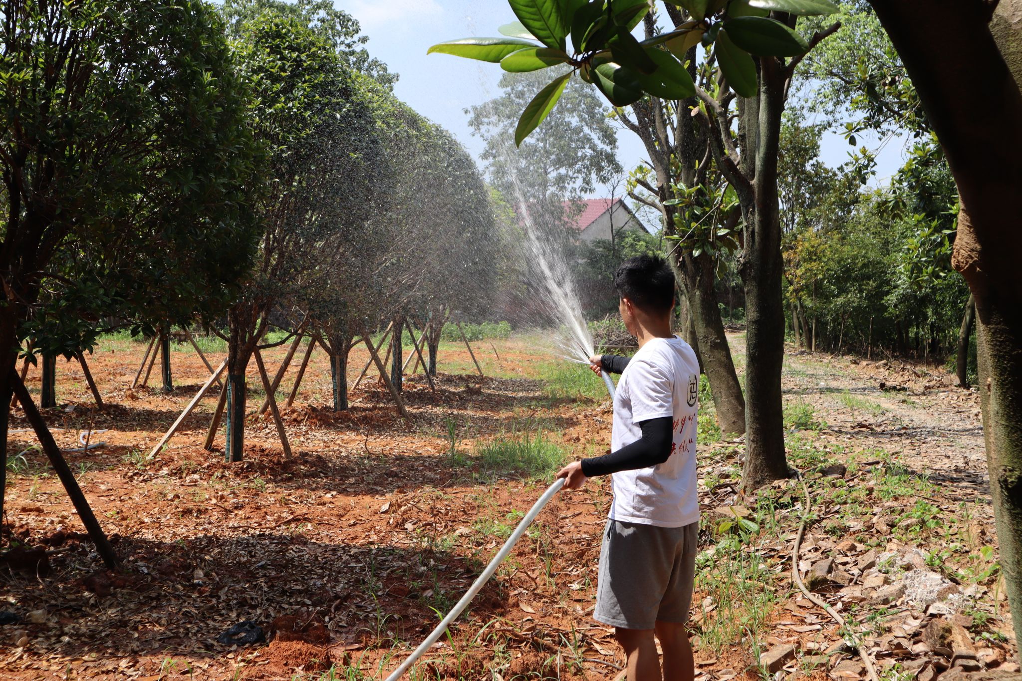 实践团成员围绕苗圃发展情况等问题进行提问,相关工作人员耐心回复。同时,在工作人员的带领下,实践团队深入田间调研,观察植被特点,体验喷洒树木,收割农作物,了解林业资源现状,发现林业发展困境,评估林业管理效果。