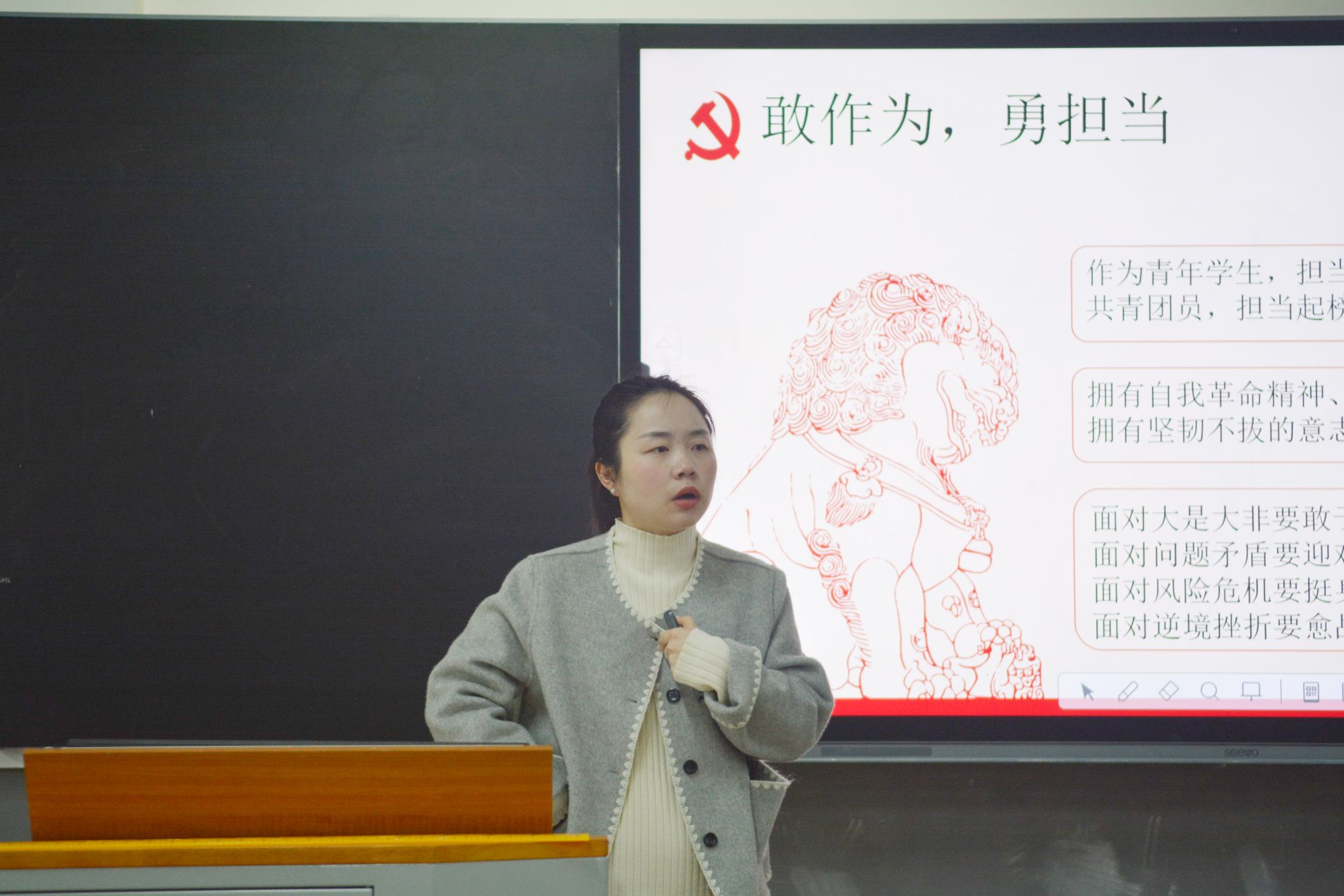 刘浩月从当前社会环境出发,就当代青年员工如何成就自我的问题进行了讲解,并从加强思想政治学习教育、加强思想政治教育、加强理论知识、加强专业专项技能学习四个方面进行阐述。她表示,当代青年要敢作为敢担当,充分了解新时代共青团员的内涵,担当起先锋榜样作用。