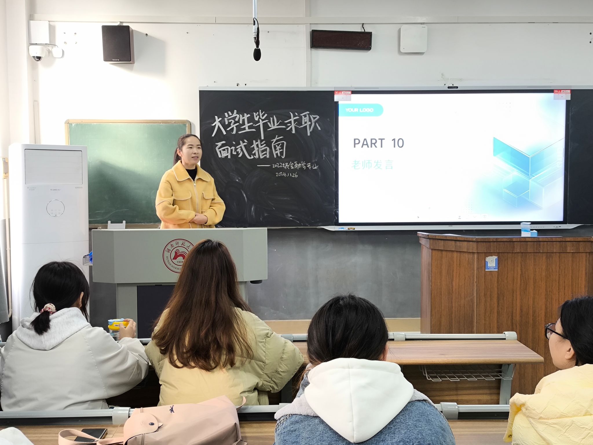 王贞作总结发言。她从定位个人优势、简历撰写技巧及面试准备要点等方面展开分析,并强调,精准定位个人优势,明确职业目标是提升求职成功率的关键。同学们应利用公司提供的就业服务平台与资源拓宽就业信息渠道,科学研判当前就业形势,结合自身优势和不足,积极调整就业预期,做好职业规划,在求职过程中始终保持积极进取的心态,踏实向前。