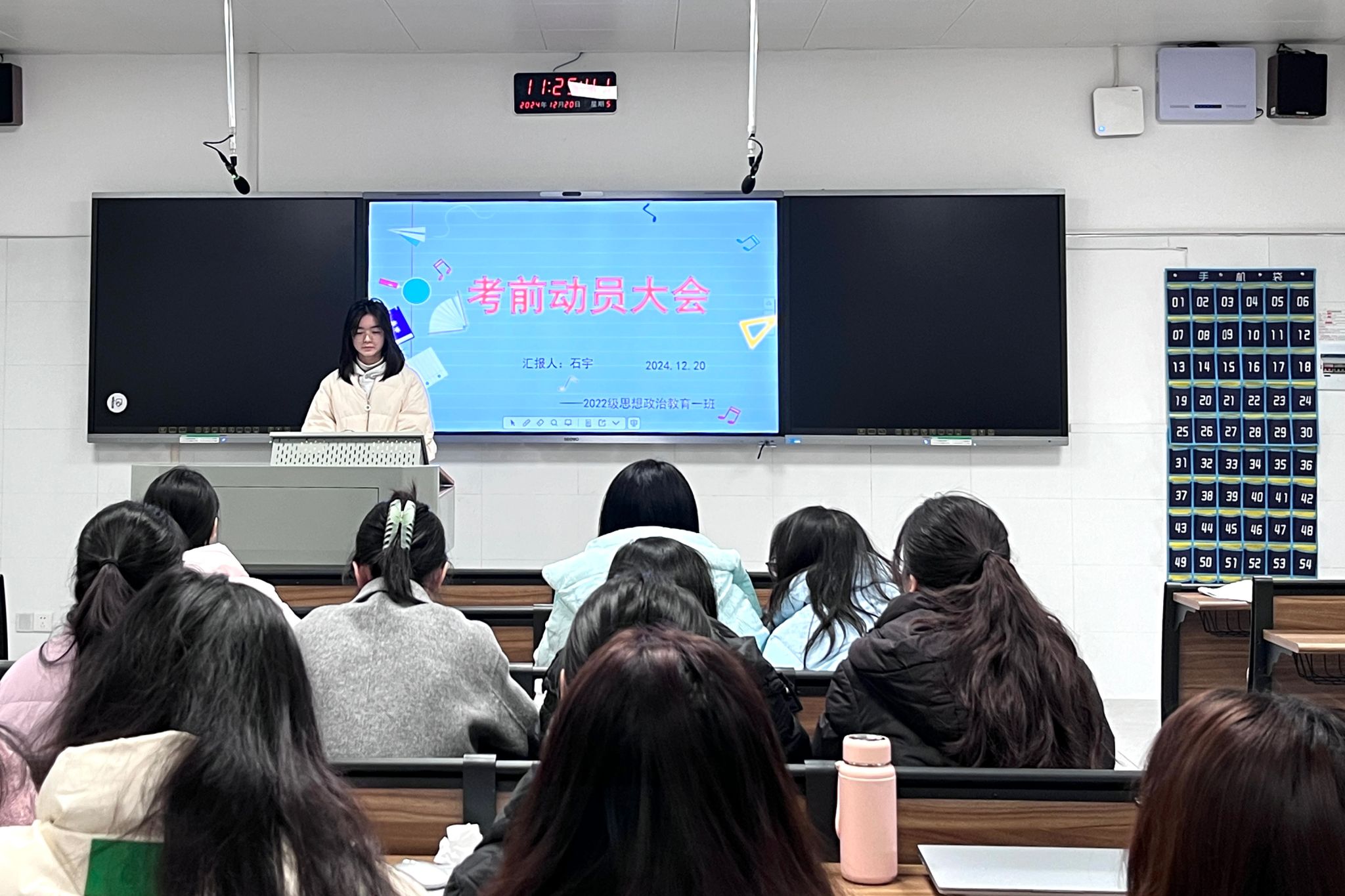 2022级思想政治教育一班学习委员石宇围绕考试复习方法、考试纪律要求两方面做了分享。她表示,期末考试是检验同学们本学期学习成果的重要方式,它不仅可以帮助我们发现自己的优势与不足,还能够总结经验教训,为今后的学习制定更有针对性的计划。她希望,同学们能够认真对待每一次考试,合理安排各个科目的复习时间,有重点、有针对性地进行复习,诚信参考,以最佳的状态迎接考试。