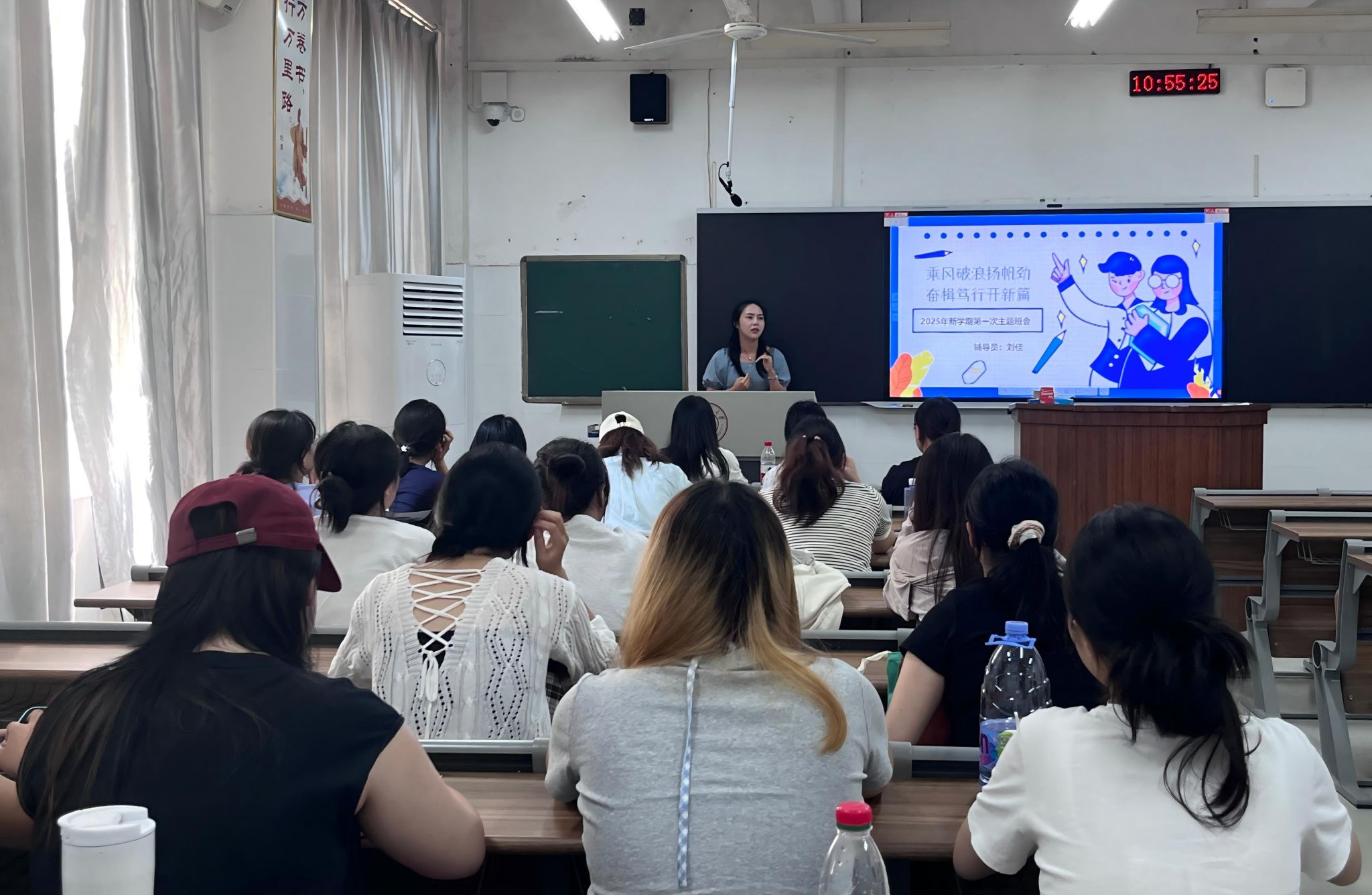 刘佳向同学们进行了自我介绍,并从收假收心、班级规章、反诈防贷和自我管理四个方面展开阐述。她鼓励同学们新学期要端正心态,制定明确的学习计划,快速进入学习状态。她强调,近期校园内电信诈骗、非法校园贷案件频发,同学们需牢记“不轻信、不透露、不转账”原则,守护好自己的财产安全。她表示,良好的纪律是班级发展的保障,希望同学们严格自律,共同营造积极向上的学习氛围。