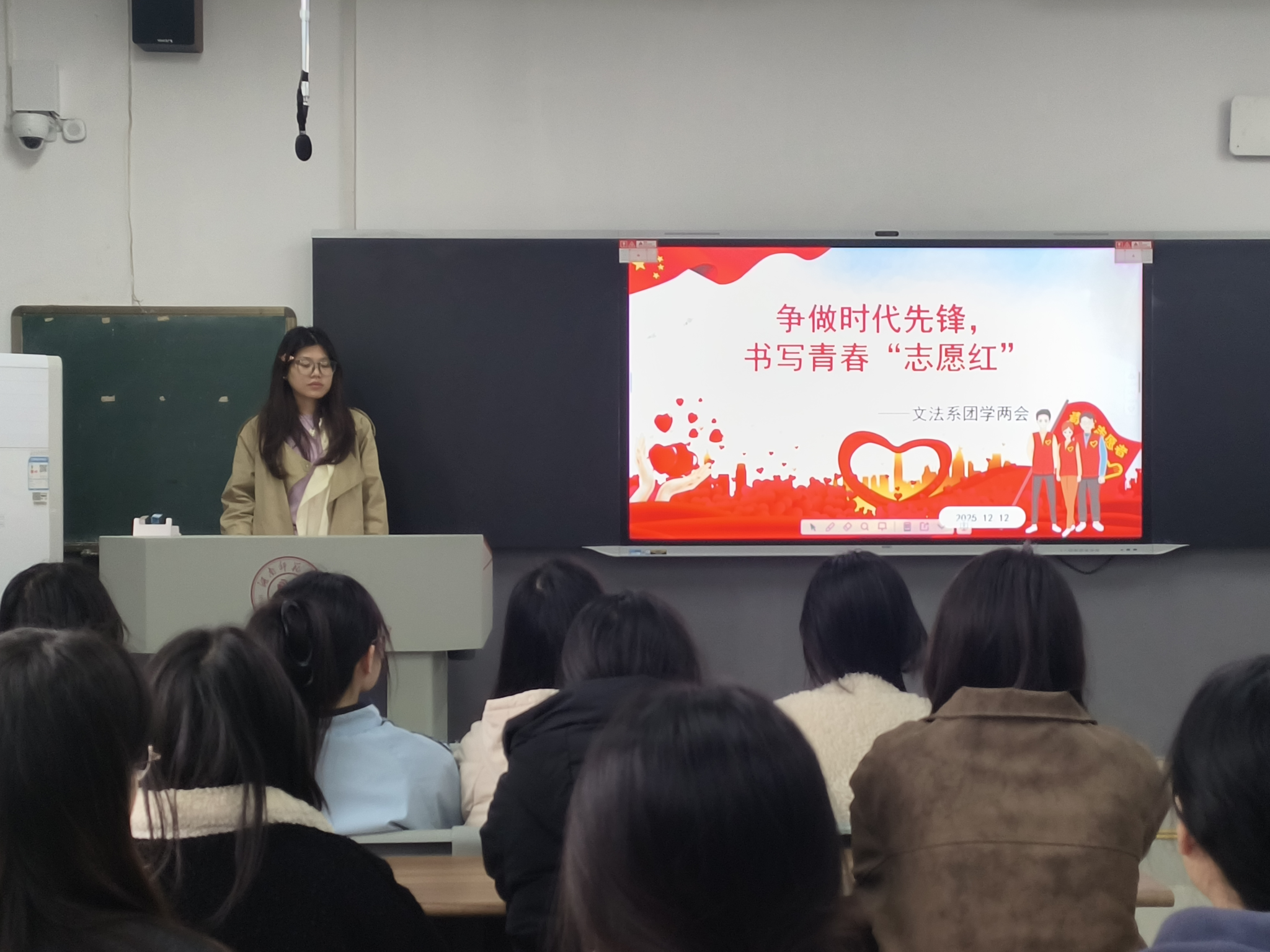 (通讯员 王俊楠 樊依冰 邓婷芳)12月12日中午,公司文法系团学两会在树达楼503教室开展以“争做时代先锋,书写青春‘志愿红’”为主题的团日活动宣讲会。活动由文法系团总支组织部副部长席伟伟主持。