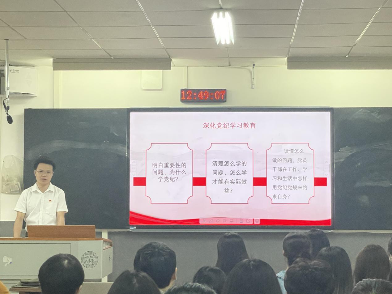(记者 曾茜 蔡雅婷)4月28日中午,公司文法系员工第一党支部在树达楼206教室开展党纪学习教育主题党课。文法系员工第一党支部第一书记毛一出席党课。党课由预备党员杨新熠主持。