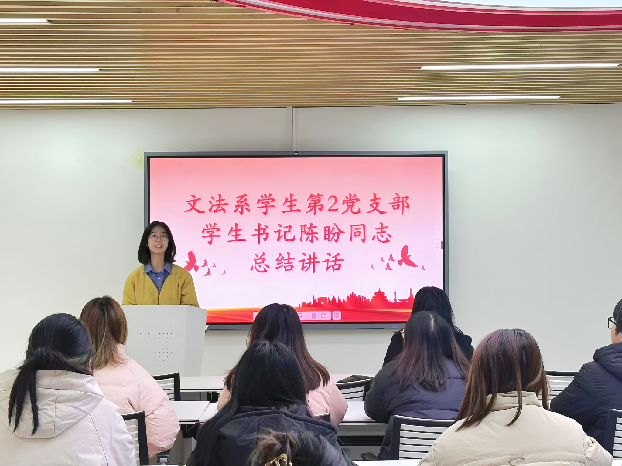 文法系员工第二党支部员工书记陈盼作活动总结。她表示,每位党员都应该对本年度的学习和工作进行年末总结,继续加强理论知识的学习,不断提高自身政治觉悟、道德品质和文化素养。