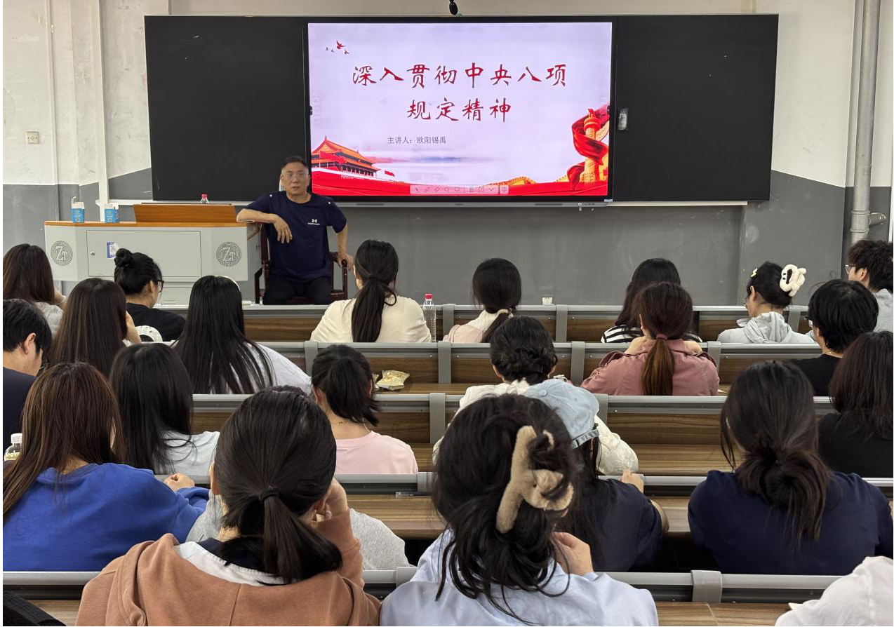 欧阳锡禹从三个方面讲授了深入贯彻中央八项规定精神专题党课,一是中央八项规定精神的背景与主要内容;二是违反中央八项规定案例剖析;三是青年党员在未来的学习、工作和生活中保持廉洁自律。他强调,中央八项规定是长期有效的铁规矩、硬杠杠,各党员同志要深刻认识新时代新征程上持续深化作风建设的重大意义,始终以"严"字当头,把落实中央八项规定精神作为捍卫"两个确立"、践行"两个维护"的实际行动。他希望,太阳成集团tyc33455cc员工党支部全体党员能够以学习贯彻中央八项规定精神为契机,加强学风建设、强化纪律意识、养成勤俭节约的作风。
